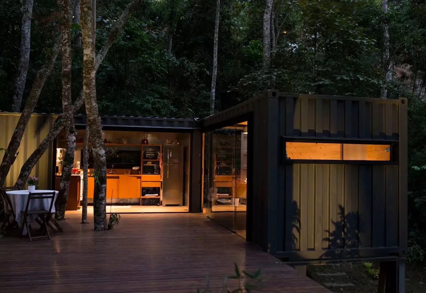 Com um design moderno e atraente, esta casa contâiner em Itaipava, no Rio de Janeiro, é uma excelente opção para desfrutar da tranquilidade da serra carioca. O imóvel conta com uma sala de estar com mesa de trabalho, uma cozinha equipada com fogão e geladeira, um quarto com cama e closet, e um banheiro compartimentado entre lavabo, toalete e box com chuveiro. Além disso, há também um deck de madeira com redes e mesa que é ideal para relaxar, praticar exercícios e até mesmo fazer um café da manhã ou jantar ao ar livre. O valor da estadia por noite na casa é de R$ 290.