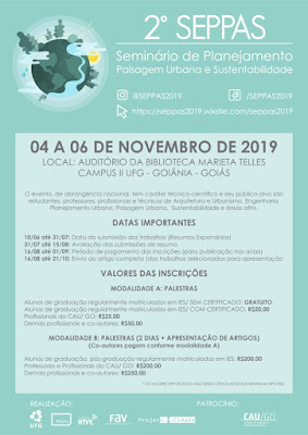 O 2º Seminário de Planejamento, Paisagem Urbana e Sustentabilidade (2º SEPPAS) será promovido pela Fundação RTVE (TV UFG) por intermédio do Programa de Pós-Graduação Projeto e Cidade (PPG-PC) da Faculdade de Artes Visuais da UFG (FAV-UFG) com patrocínio do CAU/GO. O evento acontecerá entre os dias 04 e 06 de novembro de 2019 e será realizado no Auditório Marieta Telles Machado, localizado na Biblioteca Central do Campus II (Campus Samambaia) da UFG em Goiânia-GO.