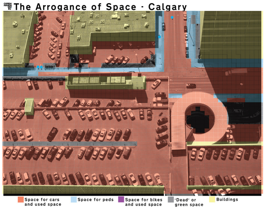 Para exemplificar seu posicionamento, Mikael analisou a quantidade de espaço que possui cada um desses grupos, além do espaço “morto” e dos edifícios, em algumas ruas de Calgary, Paris e Tóquio através da comparação de cada setor com diferentes cores.