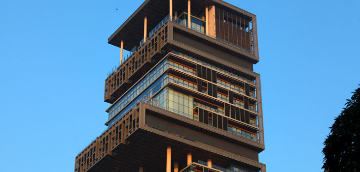 O homem mais rico da Índia, Mukesh Ambani, esbanjou sua fortuna de US$ 27 bilhões (avaliada em 2011 em R$ 47,65 bilhões) para construir Antilia, sua residência de 37 mil m² em Mumbai. O edifício unifamiliar tem 170 m de altura, 27 pisos e custou 700 milhões de dólares para ficar pronto, ganhando o título de maior e mais cara casa do mundo.