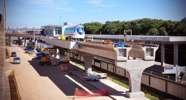 Veículo leve sobre trilhos, suspenso de 4,5 m a 9 m de altura, é movimentado pelo ar gerado por ventiladores industriais. Sistema ligará a Estação Aeroporto do Metrô e o Terminal 1 do Aeroporto Internacional Salgado Filho, em Porto Alegre, no Rio Grande do Sul. O trecho de 1 km de extensão será percorrido em até dois minutos, atingindo velocidade de máxima de 65 km/h. Confira!