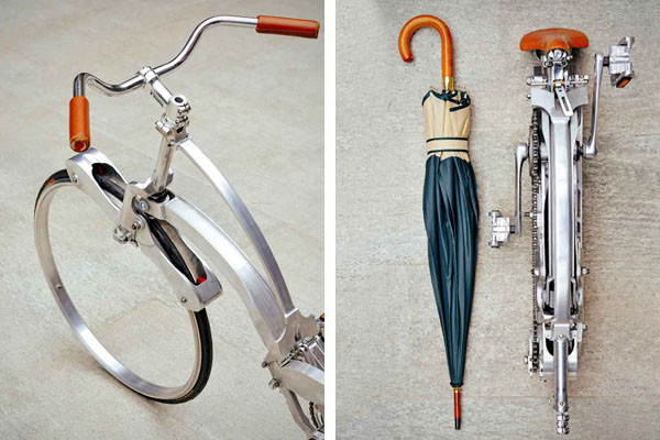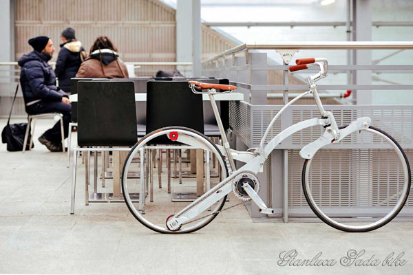 Bicicletas dobráveis têm sido de grande demanda recentemente por sua leveza e facilidade de transporte, mas o designer italiano Gianluca Sada tem superado os limites, criando uma bicicleta que pode ser dobrada e ocupar o mesmo espaço de um guarda-chuva. A bicicleta de Sada é uma bicicleta hubless caracterizada por um quadro que se dobra ao máximo tornando ainda mais portátil.