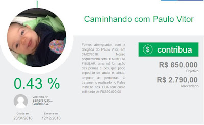 “Fomos abençoados com a chegada do Paulo Vitor, em 07/02/2018. Nosso pequerrucho tem HEMIMELIA FIBULAR, uma má formação das pernas e pés, que pode impedi-lo de andar e, ainda, amputar as perninhas. O tratamento realizado no Paley Institute nos EUA tem custo estimado de R$650.000,00”
