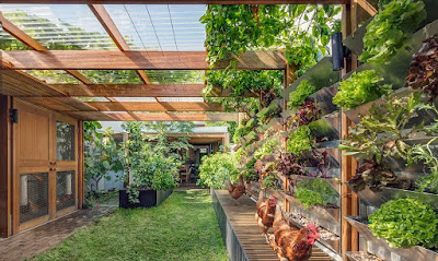 O jardim que fica nos fundos da casa tem um sistema de aquaponia que otimiza o cultivo de hortaliças, uma área para compostagem, uma horta e um galinheiro.