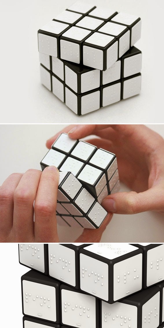 O conceito criado pelo designer alemão Konstantin Datz ultrapassou a barreira do óbvio e foi desenvolvido especialmente para deficientes visuais. Totalmente branco, cada face dos quadrados possui a cor equivalente no sistema Braille. Sendo assim, os cegos podem “sentir” as cores e tentar resolver o cubo, que continua tão difícil como sempre. Vale o Clique!