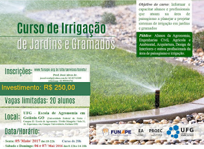O curso será realizado em Goiânia. A nova edição acontecerá nos dias 05 a 07 de Maio com objetivo de informar e capacitar alunos e profissionais atuantes na área de paisagismo sobre o planejamento e projeto de sistemas de irrigação em jardins e gramados.