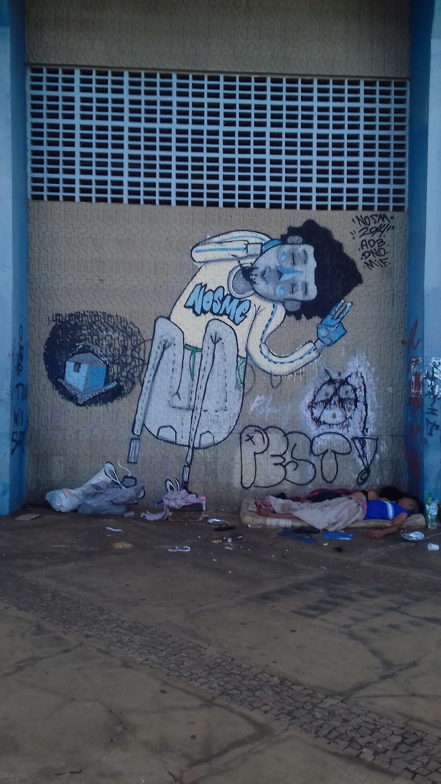 5.Um casal em situação de rua dorme sob os olhos do grafitti na parede da quadra da Federação Goiana de Futsal (desativada)