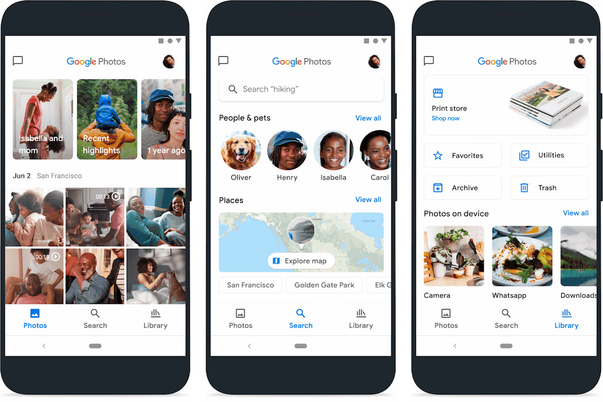 Além disso, a busca ficou mais evidente, sendo incorporada ao menu de três abas, junto com as opções Fotos e Biblioteca.