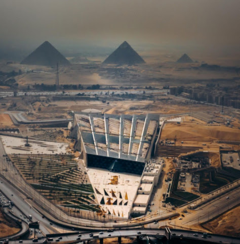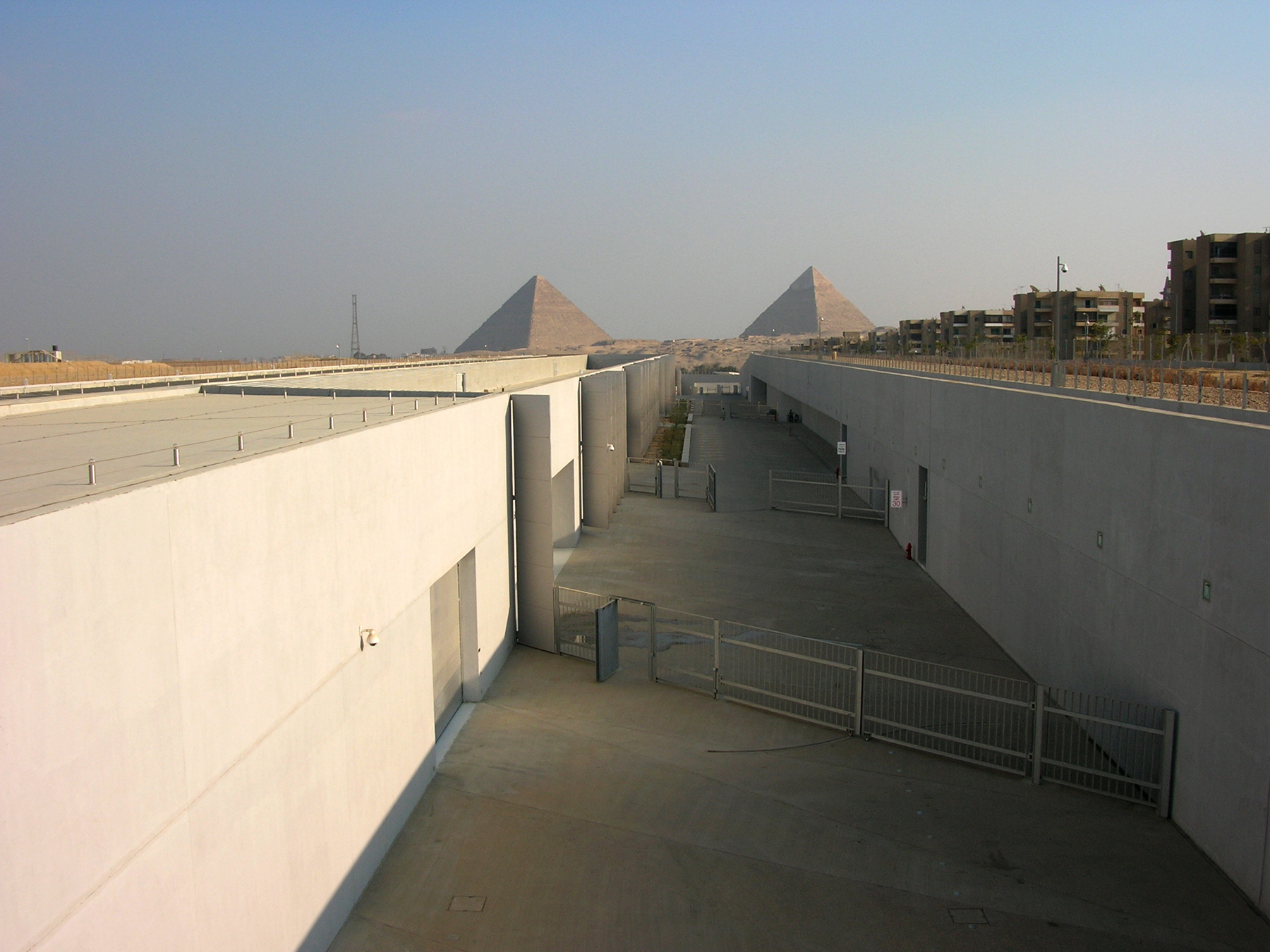 A topografia do terreno junto ao sítio arqueológico de Gizé, o qual cobre uma área de mais de 500.000 metros quadrados, é definida por uma diferença de nível de até 50 metros–escavada na paisagem pela contínua passagem das águas do Nilo. Enquanto as três pirâmides ficam em pleno deserto, o edifício do museu encontra-se encaixado entre o vale do Nilo e o planalto das pirâmides, operando como um elemento de conexão entre duas zonas geológicas diferentes.