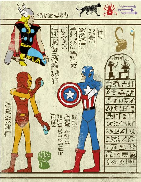 Imagine entrar em uma pirâmide e encontrar, nas paredes, imagens de personagens como o Thor, Capitão América e Homem de Ferro. Essa foi a ideia do ilustrador e designer gráfico Josh Lane ao criar a serie Hero-glyphics.