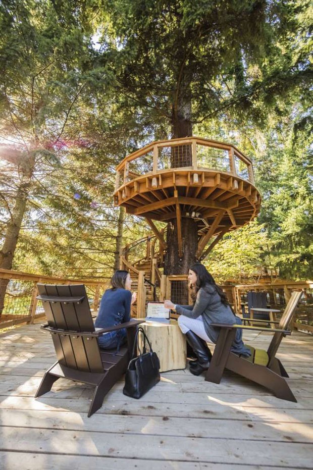 A arquitetura é um show à parte e está à noroeste do Pacífico. A 12m de altura, duas portas arqueadas se abrem para uma casa feita de cedro, que exala seu cheiro característico. Uma mesa ao centro lembra uma casa de campo e muda totalmente o clima de uma reunião corporativa, aproximando os funcionários. Na parte superior da casa de campo, ao centro, uma claraboia é responsável por tornar o espaço iluminado. Para tornar o trabalho possível, embora a casa seja em uma árvore, em todos os cantos há redes wi-fi. Há áreas externas aproximar o funcionário ainda mais das árvores, onde também existe internet disponível. Confira!