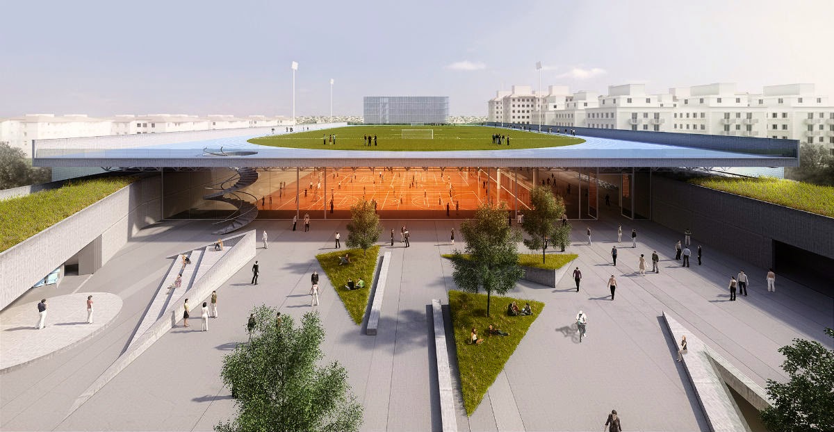 No setor principal entre os volumes retangulares, um campo de futebol gramado paira sobre as demais áreas do complexo poliesportivo composto por arenas, piscinas, vestiários e ambientes de convivências. Confira!