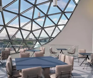Ao projeto original do arquiteto brasileiro, foram acrescentadas tecnologias para tornar o design mais sustentável. É o caso das 144 peças de vidro triangulares incorporadas na esfera, que foram desenvolvidas pela Eyerise para regularem naturalmente a temperatura no interior do prédio. As peças de vidro utilizam a tecnologia de cristal líquido da marca, fazendo com que sejam capazes de iluminar ou ofuscar o interior da construção instantaneamente, diminuindo o consumo de energia no local.