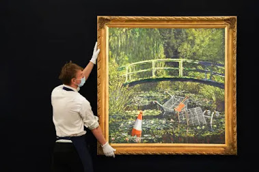 A obra Show Me The Monet do artista de rua inglês Banksy, que faz uma releitura das famosas nenúfares impressionistas de Claude Monet, foi vendida por 7,6 milhões de libras esterlinas em leilão na Inglaterra. O valor, que equivale a 55 milhões de reais (na cotação atual), estava antes estimado entre 3,5 e 5 milhões de libras e foi negociado em uma guerra de lances de cerca de nove minutos de duração, segundo a galeria inglesa Sotheby’s.