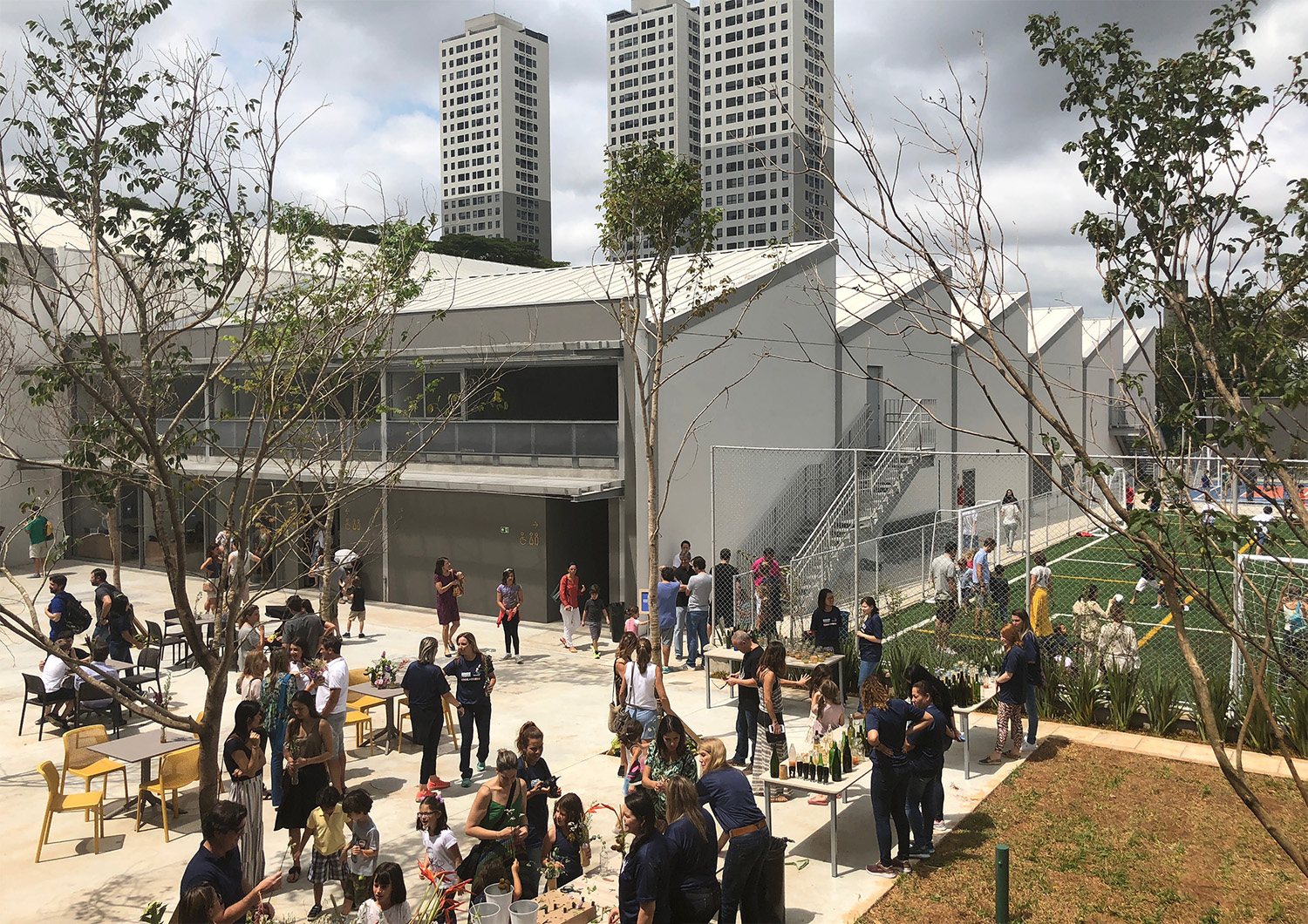 Em seguida, um bloco com ginásio e espaço multiuso com auditório para 440 lugares, refeitório, salas de arte e música. Neste caso, há uma mistura de estrutura mista metálica com lajes pré-moldadas de concreto armado e estrutura metálica com laje steel deck. O quarto e último bloco é composto de salas de aula, biblioteca, área de atendimento aos pais, secretaria e coordenações. É onde mais houve aproveitamento da estrutura preexistente. Foi realizada também ampliação com estrutura metálica e lajes pré-moldadas e estrutura de concreto armado.