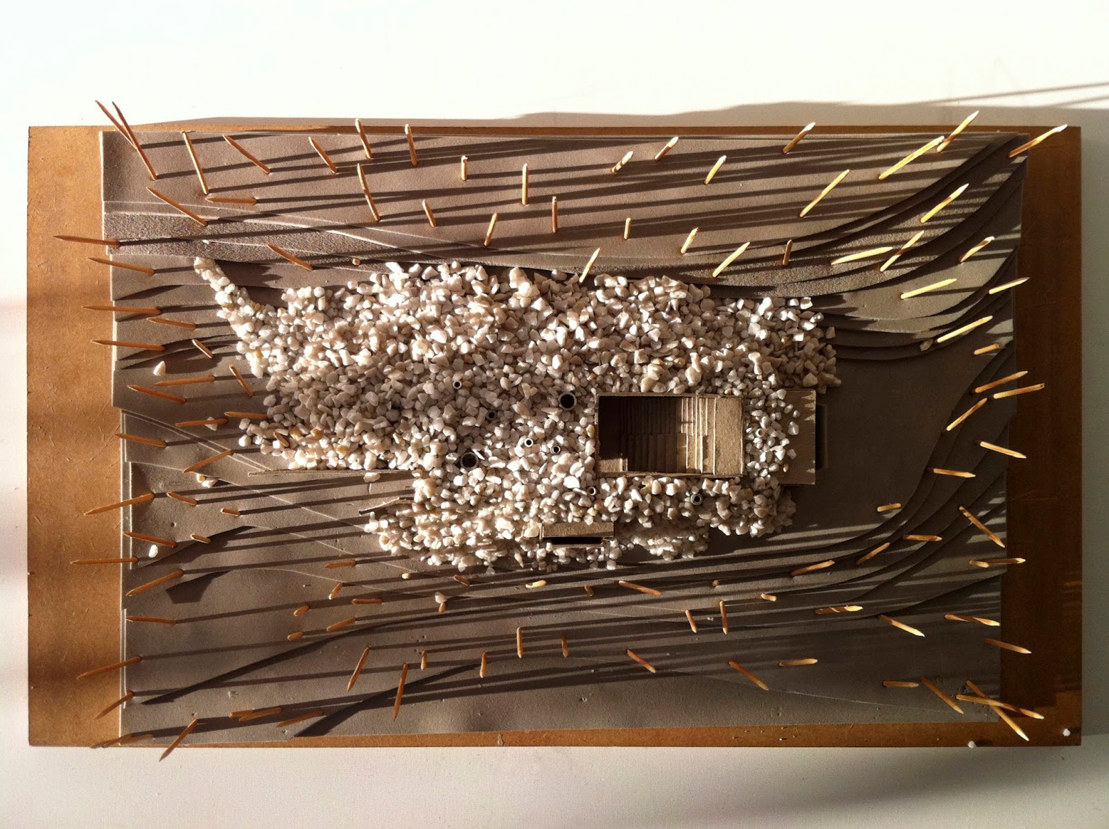 O segundo: “Inhotim” é o projeto de construção do futuro pavilhão do Centro de visitantes do Instituto Cultural de Inhotim, situado no coração da Mata Atlântica das Minas Gerais no Brasil. Ele é um dos novos lugares famosos dedicados à arte contemporânea. Desenhado por Burle Marx, o jardim botânico d’Inhotim conta com cerca de cem hectares e nele estão localizados aproximadamente vinte pavilhões e uma coleção de mais de 700 obras e instalações. A natureza e a arte estão em simbiose e fazem deste local de arte o mais importante da América latina. A simplicidade deste projeto arquitetônico vem do equilíbrio justo entre o abrigo natural e o espaço edificado contemporâneo, sugerindo uma reflexão sobre a relação entre o homem e o meio ambiente, a construção e a arquitetura. O prédio sem fundação, sem porta nem ar-condicionado foi projetado em uma busca permanente da redução do seu impacto no meio ambiente. O edifício criado um diálogo na sua composição entre o material extraído em seu estado natural (ferro) e do material processado (aço). Ele é autossuficiente em água, eletricidade. A maquete do projeto “Inhotim” é feita em madeira, pedras e papel cartão, ela está acompanhada de seus desenhos.