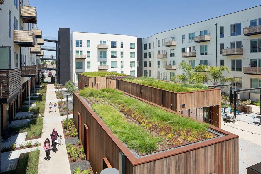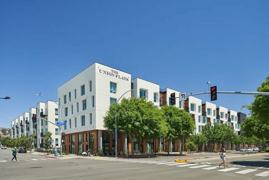 A arquitetura pré-fabricada e a eficiência energética andam de mãos dadas no Union Flats, um dos maiores empreendimentos habitacionais modulares concluídos no norte da Califórnia. Localizada em Union City, em frente a uma nova praça pública e à estação BART, a comunidade orientada ao trânsito celebra a capacidade de caminhar e o ar livre com suas comodidades e proximidade com o espaço verde. Concluído em agosto de 2018 por David Baker Architects, o projeto movido a energia solar obteve a certificação LEED Platinum e inclui 40 lofts flexíveis de trabalho – um novo tipo de moradia para Union City.