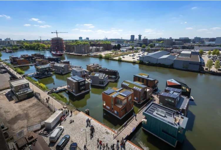 A vida sobre a água pode ser uma solução para estes dois grandes problemas. Esta ideia deu origem a um bairro em Amsterdã, capital da Holanda, país que sempre se adaptou muito bem às adversidades e tem um quarto do seu território abaixo do nível do mar.