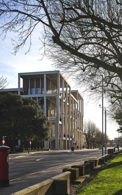 O centro de ensino londrino aposta no concreto em seu exterior, com as vigas do material formando molduras nos três níveis do prédio.