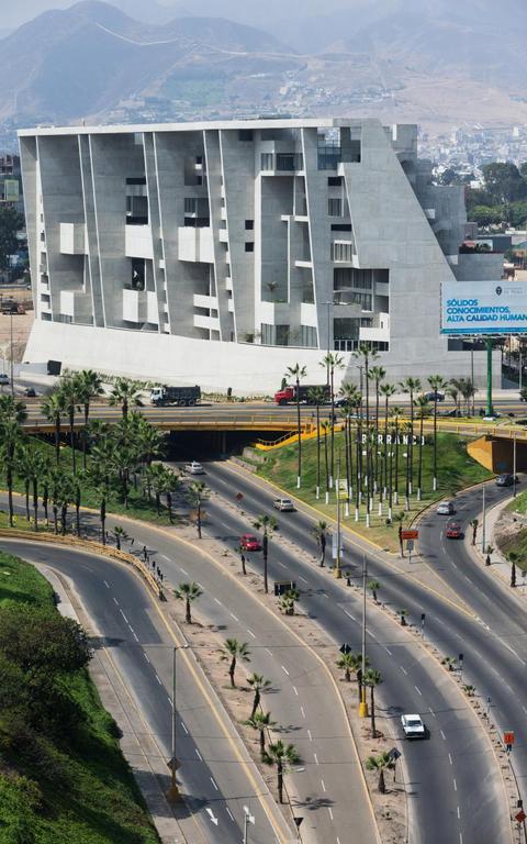 Com 10 andares, o prédio tem seu exterior feito com placas de concreto, formando uma topografia artificial no bairro de Barranco, na orla de Lima.